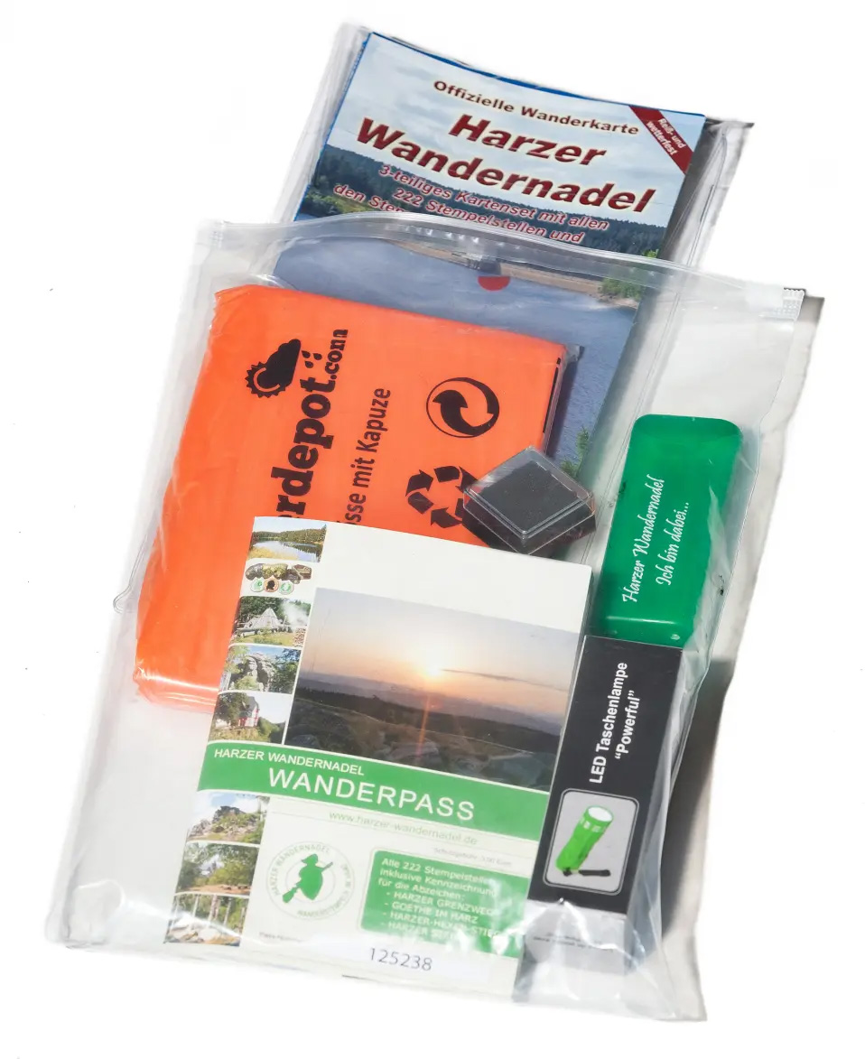 Einfach Einpacken und Loswandern! Mit dem Harzer Wandernadel Starter-Pack sind Sie für fast jede Situation beim Wanderstempeln gerüstet. Ob Regenwetter oder ein trockenes tempelkissen – das Starter-Pack bietet für jede Situation das richtige Hilfsmittel. Das Starterpack enthält in einer verschließbaren Dokumententasche: 1 x Wanderkarte (3-Karten-Set) 1 x Wanderpass 1 x Regenponcho 1 x Stempelkissen 1 x Taschenlampe 1 x Pflasterbox